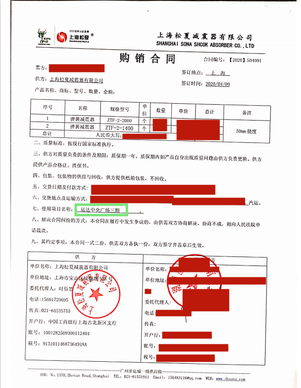 上海松夏減震器有限公司官方網(wǎng)站為您介紹:【長沙運(yùn)達(dá)廣場項(xiàng)目】使用ZTF可調(diào)式彈簧減震器采購合同信息,我們松夏公司2020年為【長沙運(yùn)達(dá)廣場項(xiàng)目】使用ZTF可調(diào)式彈簧減震器,起到了減震和降噪的作用,以下是【長沙運(yùn)達(dá)廣場項(xiàng)目】使用ZTF可調(diào)式彈簧減震器采購合同介紹